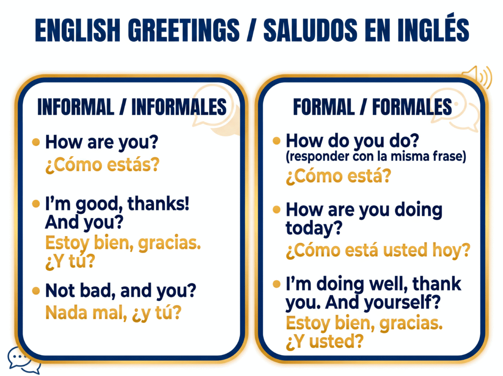 Estos saludos se usan con amigos, compañeros de clase o personas de tu misma edad. Son fundamentales para cualquier práctica de conversación en inglés - english speaking practice - del día a día.