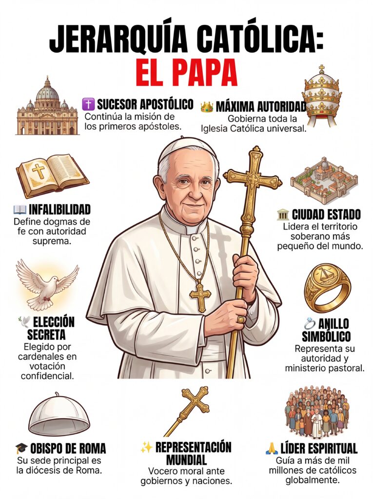 1. Papa El Papa es la máxima autoridad de la Iglesia Católica y sucesor de San Pedro en Roma. Tiene la responsabilidad espiritual y administrativa de guiar a toda la Iglesia a nivel mundial, establecer doctrina, canonizar santos y representar a la Iglesia ante el mundo.