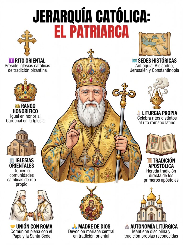 3. Patriarca El Patriarca lidera las antiguas iglesias orientales en plena comunión con Roma. Su función es preservar los ritos litúrgicos, las tradiciones y la identidad espiritual de las comunidades católicas orientales (como la Iglesia Copta Católica o la Greco-Católica Ucraniana).