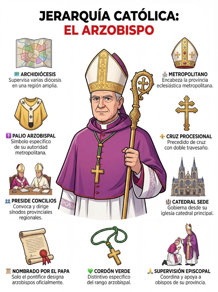 4. Arzobispo El Arzobispo dirige una archidiócesis, que es una agrupación de varias diócesis. Coordina el trabajo pastoral de los obispos de su región y tiene autoridad metropolitana sobre las diócesis sufragáneas.