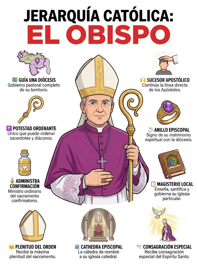 5. Obispo El Obispo guía una diócesis específica y es considerado sucesor directo de los Apóstoles. Es responsable de la enseñanza de la fe, la ordenación de sacerdotes y diáconos, y la supervisión pastoral de su territorio.