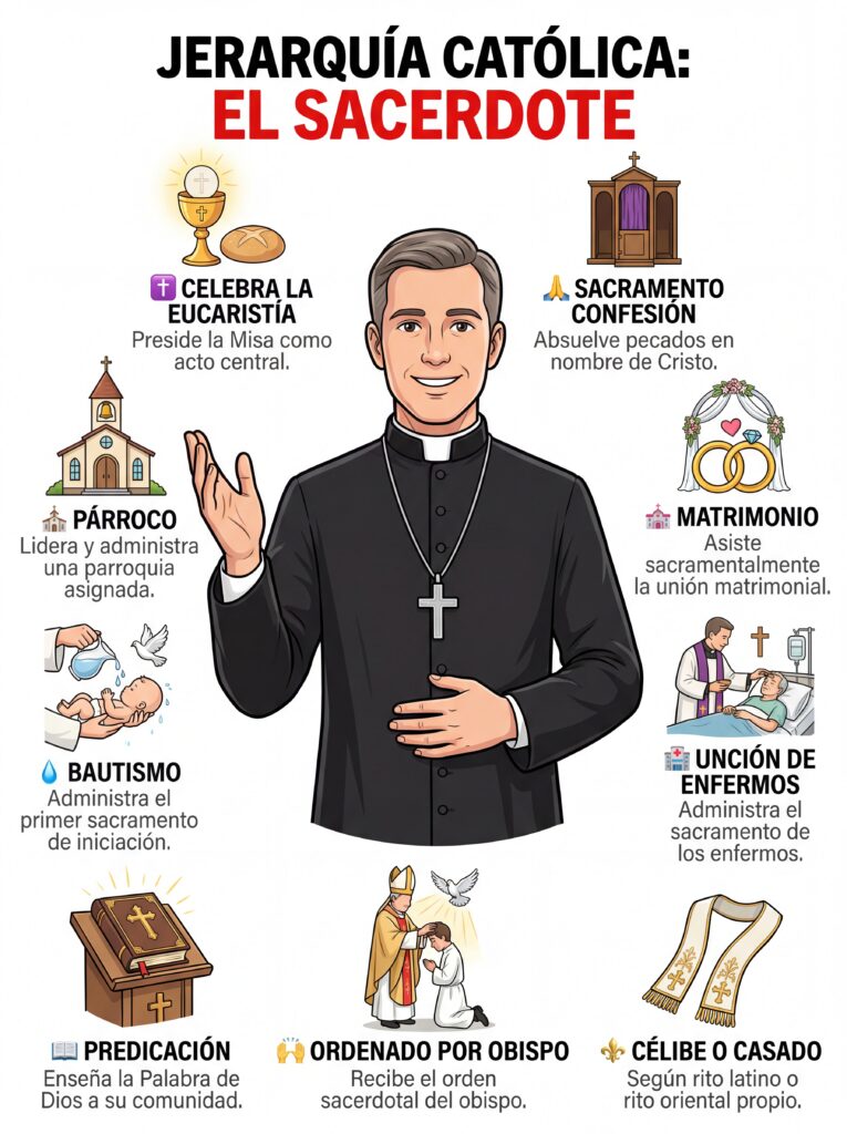7. Sacerdote El Sacerdote es el ministro que celebra los siete sacramentos (especialmente la Eucaristía y la Reconciliación) y lidera una parroquia local. Es el vínculo más cercano entre la Iglesia institucional y los fieles en su comunidad cotidiana.