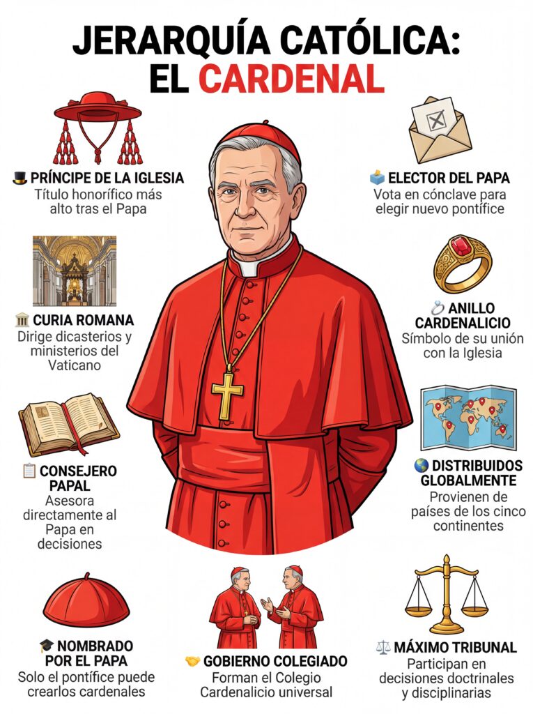 2. Cardenal Los cardenales son los principales consejeros del Papa y los únicos con derecho a elegirlo en el Cónclave. Suelen dirigir diócesis importantes, dicasteries (ministerios vaticanos) o cumplir roles diplomáticos en nombre de la Santa Sede.