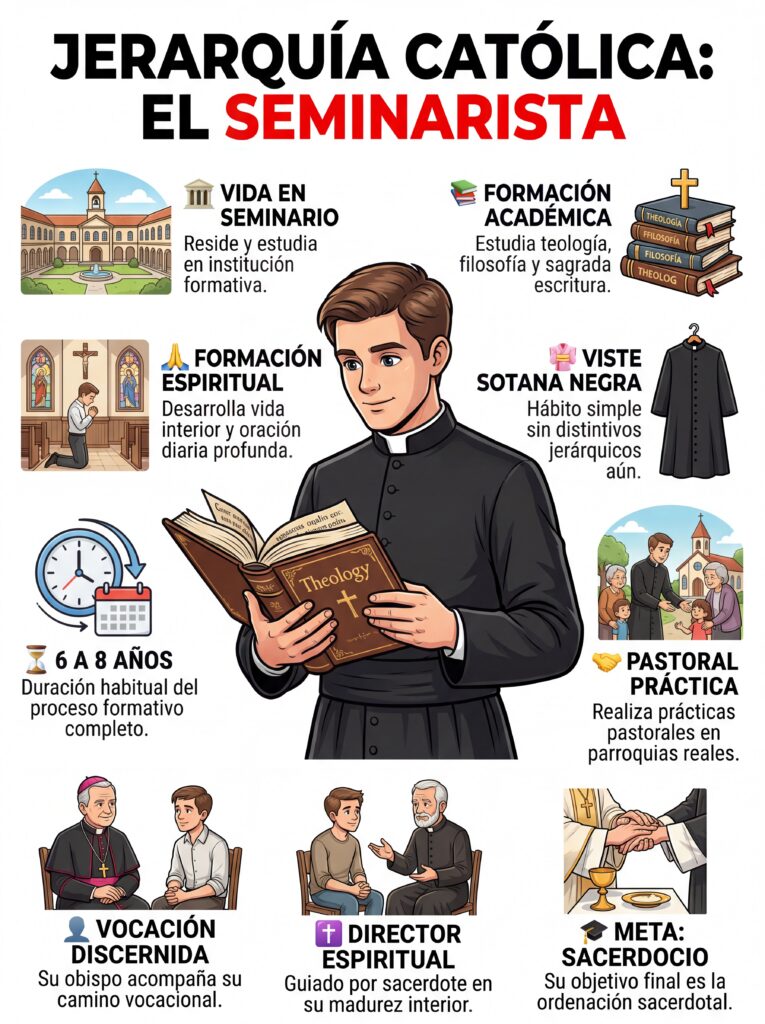9. Seminarista El Seminarista es el estudiante que se forma en un seminario para acceder al sacerdocio. Durante años de estudio filosófico, teológico y espiritual se prepara para recibir la ordenación sacerdotal.