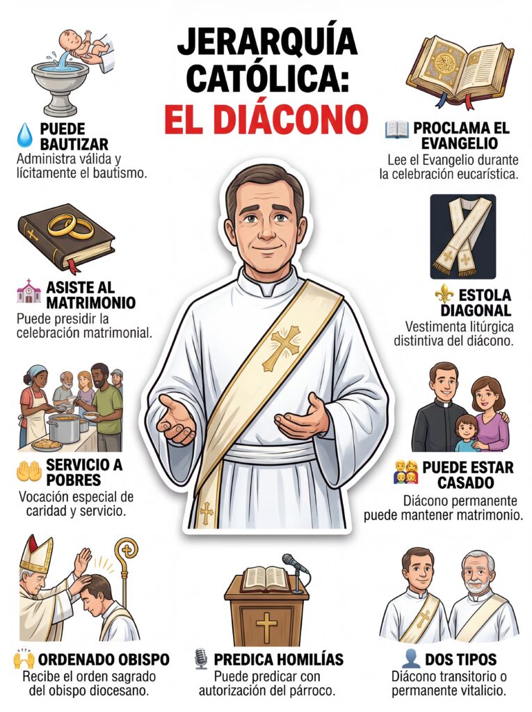 8. Diácono El Diácono asiste al sacerdote en las funciones litúrgicas y pastorales. Puede administrar el bautismo, presidir bodas, proclamar el Evangelio, predicar homilías y realizar obras de caridad. Existen diáconos transitorios (en camino al sacerdocio) y diáconos permanentes (que pueden ser casados).
