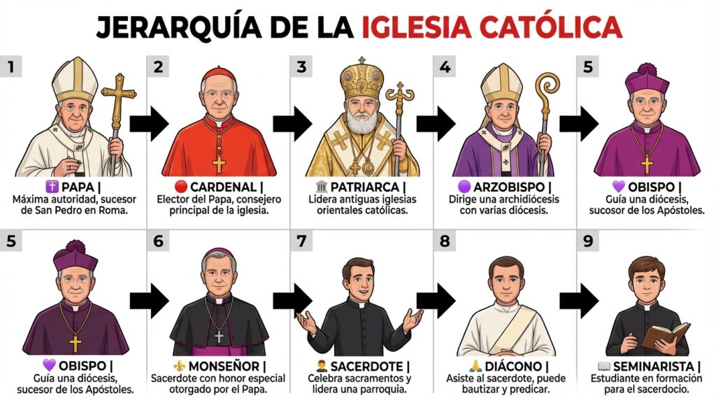 La Iglesia Católica está organizada en una estructura jerárquica de nueve niveles, cada uno con responsabilidades específicas dentro de la comunidad de fieles.
